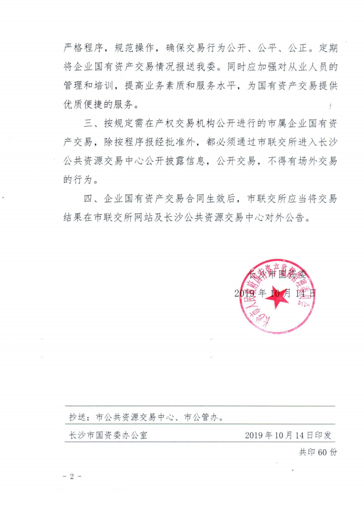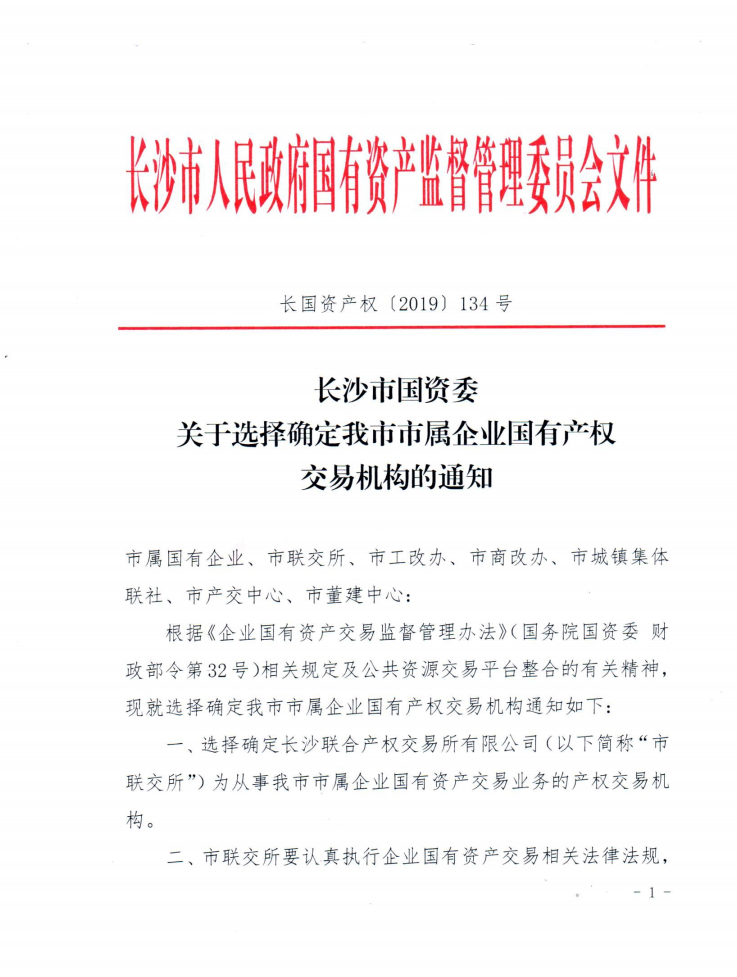 長沙市國資委關(guān)于選擇確定我市市屬企業(yè)國有產(chǎn)權(quán)交易機(jī)構(gòu)的通知(長國資產(chǎn)權(quán)(2019)134號文)