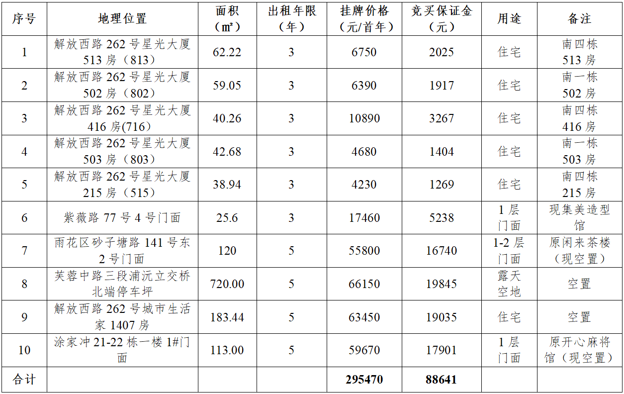 受委托,我司將于2025年12月5日14:30開(kāi)始在長(zhǎng)沙公共資源交易中心二樓開(kāi)標(biāo)室對(duì)長(zhǎng)沙市解放西路、砂子塘路、湘府西路等42處經(jīng)營(yíng)性資產(chǎn)租賃權(quán)(第二次)進(jìn)行公開(kāi)拍賣,本次剩余招租標(biāo)的共10處,起拍價(jià)共29.547萬(wàn)元/首年,競(jìng)買保證金金額詳見(jiàn)長(zhǎng)沙公共資源交易中心拍賣公告公示內(nèi)容、標(biāo)的清單。 競(jìng)買人資格條件:具有完全民事行為能力的自然人,以及依法登記設(shè)立、有效續(xù)存的企業(yè)法人,均可憑有效證明辦理報(bào)名手續(xù);原承租人須結(jié)清應(yīng)付租金后,由委托人確認(rèn)后方可報(bào)名。 展示時(shí)間地點(diǎn):2025年12月3日至4日9:00-16:00,標(biāo)的所在地進(jìn)行展示。 競(jìng)買登記報(bào)名時(shí)間地點(diǎn):2025年12月3日至4日9:00-16:00,長(zhǎng)沙市芙蓉區(qū)馬王堆中路248號(hào)長(zhǎng)沙聯(lián)合產(chǎn)權(quán)交易所有限公司一樓。 報(bào)名步驟: (1)首先完成長(zhǎng)沙市公共資源交易數(shù)字證書(shū)及簽章辦理,湖南CA咨詢電話:4006682666; (2)有意競(jìng)買者請(qǐng)?jiān)陂L(zhǎng)沙國(guó)有資產(chǎn)電子交易系統(tǒng)上注冊(cè)、辦理網(wǎng)絡(luò)報(bào)名手續(xù); (3)前往競(jìng)買登記報(bào)名地點(diǎn)辦理線下競(jìng)買申請(qǐng)登記手續(xù),逾期不予辦理。 競(jìng)買保證金:請(qǐng)繳至【賬號(hào):競(jìng)買人需使用IE瀏覽器登錄并注冊(cè)“長(zhǎng)沙國(guó)有資產(chǎn)電子交易系統(tǒng)http://gyzc.csggzy.cn/TPBidder”,點(diǎn)擊報(bào)名生成保證金子賬號(hào)(繳納保證金時(shí)備注項(xiàng)目名稱)。】繳納截止時(shí)間為2025年12月4日16:00(以到賬為準(zhǔn))。 咨詢電話:0731-82710283 王女士 標(biāo)的詳情請(qǐng)關(guān)注微信公眾號(hào)“長(zhǎng)沙聯(lián)交所”或“長(zhǎng)沙市拍賣行”